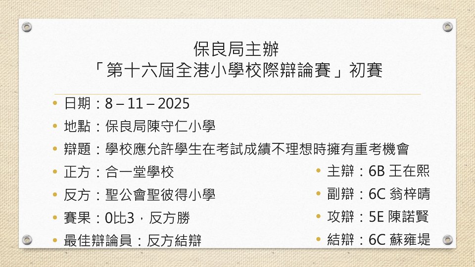 本校勝出保良局主辦「第十六屆全港小學校際辯論賽」初賽及奪得最佳辯論員