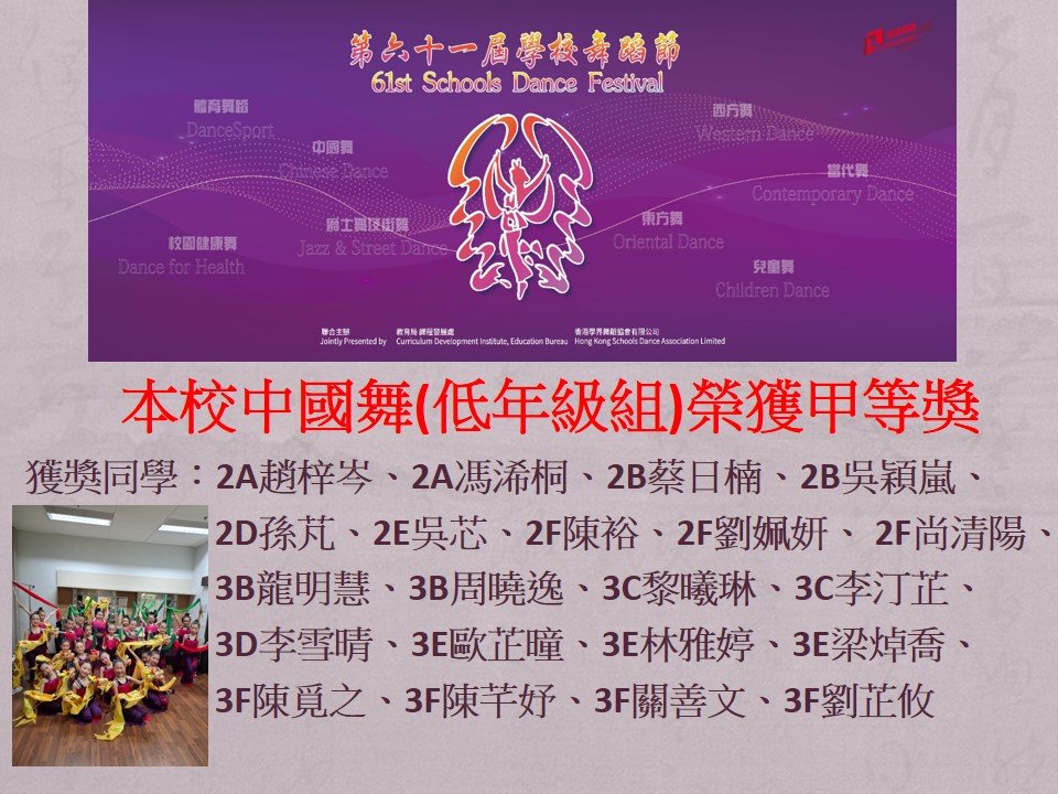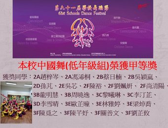本校中國舞(低年級組)榮獲第六十一屆學校舞蹈節甲等奬
