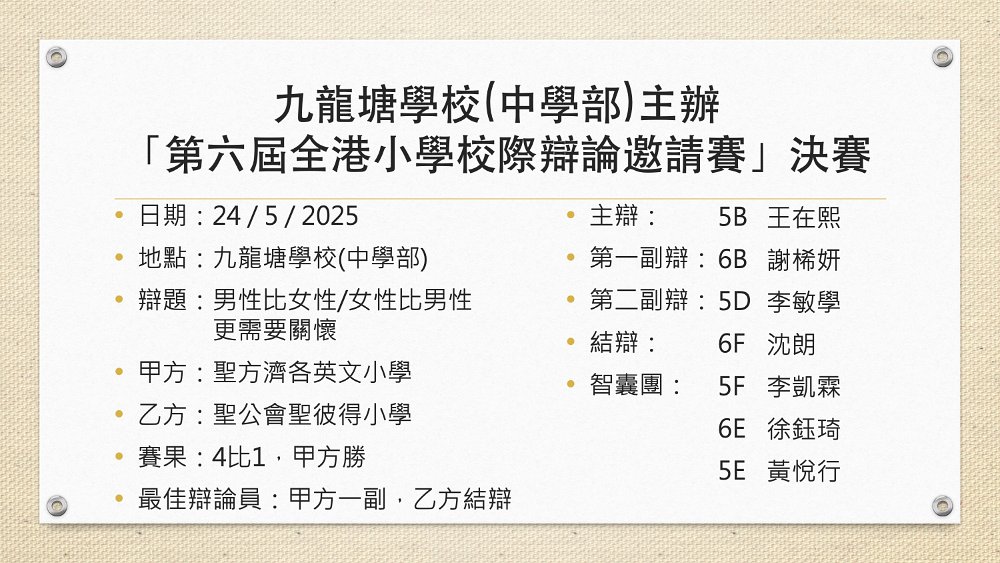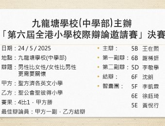 本校奪得九龍塘學校(中學部)主辦「第六屆全港小學校際辯論邀請賽」亞軍及奪得最佳辯論員
