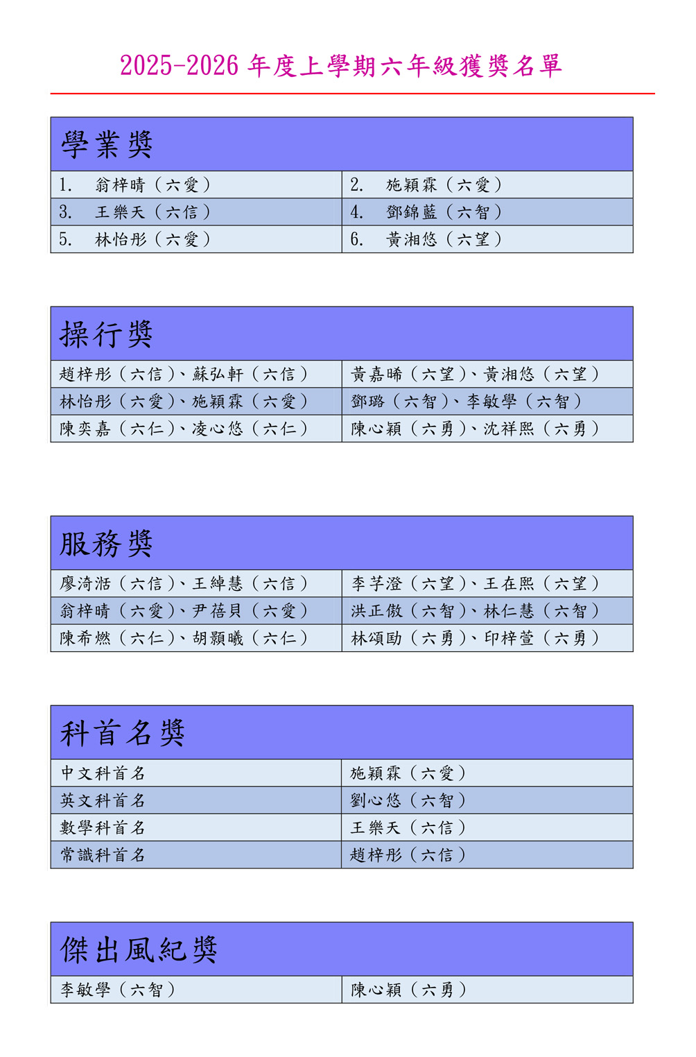 2025-2026年度上學期比賽獲獎名單